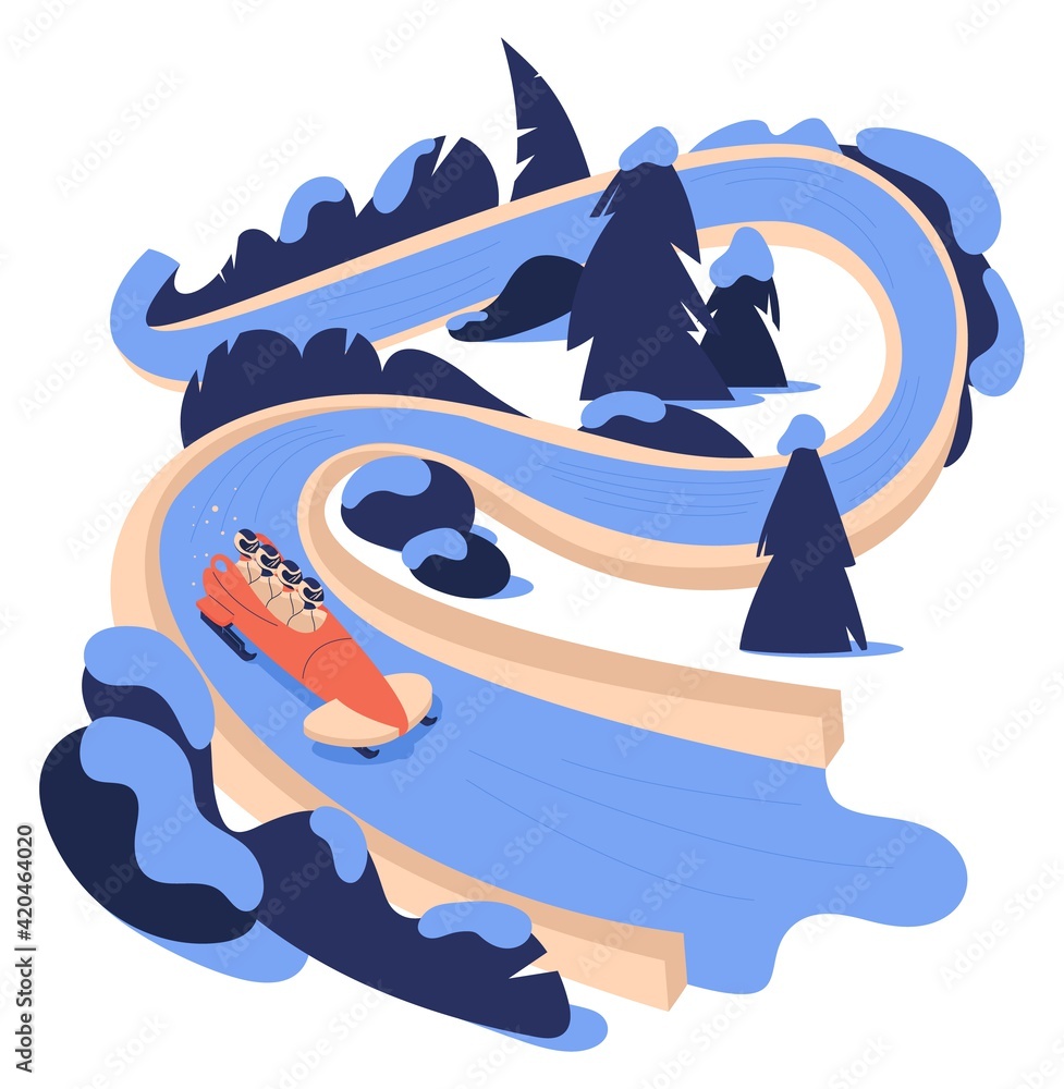 Samolepka Bobsled or bobsleigh track with people riding sled in winter landscape