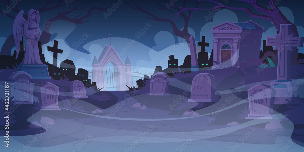 Samolepka Night cemetery, graveyard with tombstones in fog