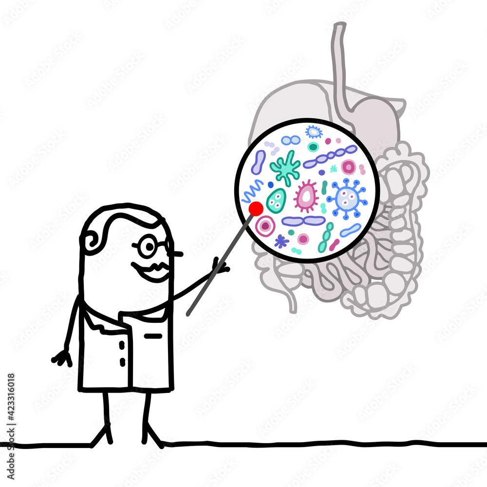 Samolepka Cartoon Doctor Explaining what is Micro-biota in the Digestive System