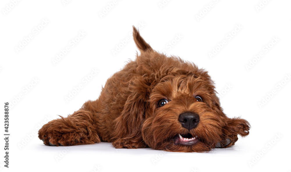 Samolepka Red Cobberdog aka Labradoodle pup, laying head down with a silly face