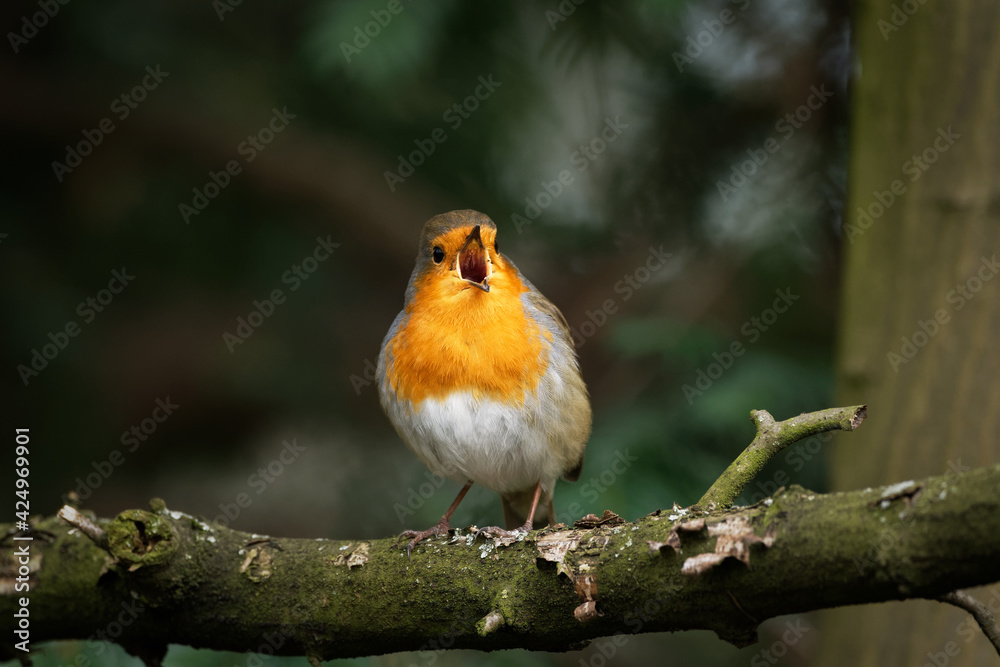 Samolepka robin on a branch singing joyfully with beak wide open