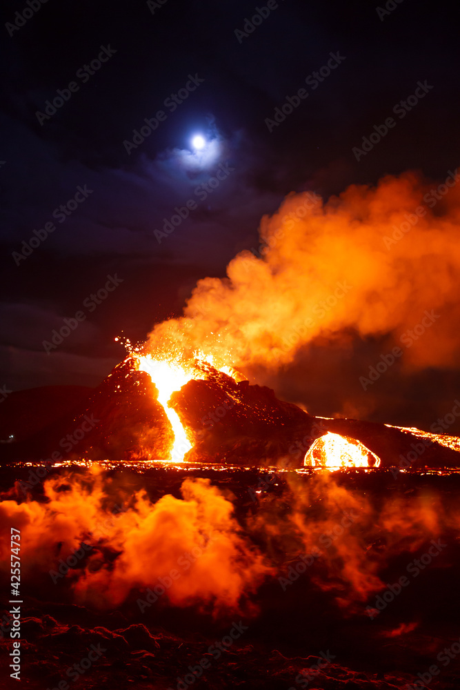 Samolepka Moon over erupting volcano in Geldingadal Iceland