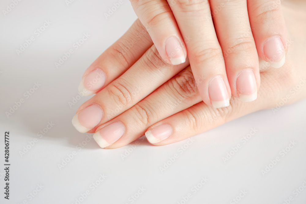 Samolepka Closeup of beautiful hands and fingernails of woman on white background, Concept of health care of the fingernail