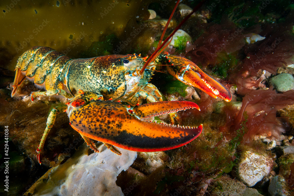 Samolepka American lobster underwater foraging for food on rocky bottom.