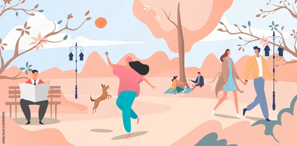 Samolepka Lovely autumn urban garden place, cheerful people walking spring morning park, banner stroll area flat vector illustration