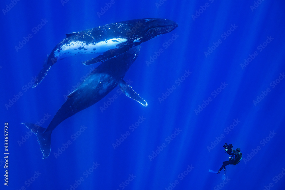 Samolepka two humpback whales resting at dawn in french polynesia deep waters with a diver