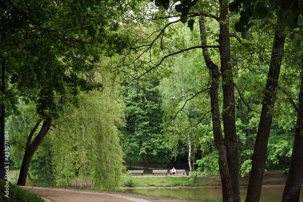 Samolepka Scenery green nature view of moscow city park on cloudy day