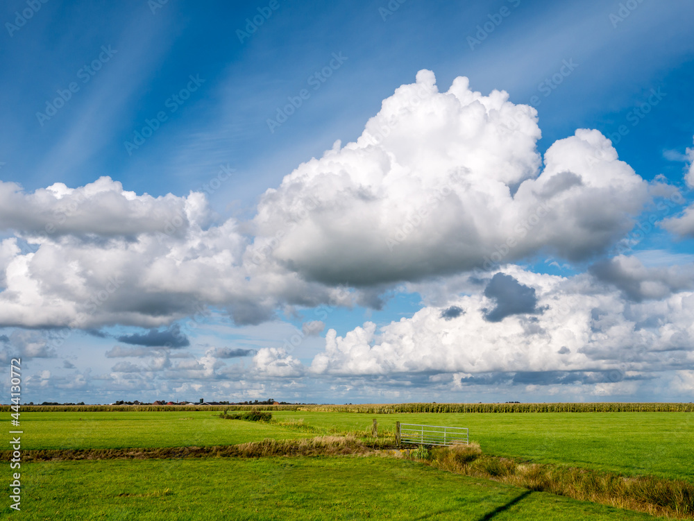 Samolepka Cumulus clouds and polder landscape with grass near Grou, Friesland, Netherlands