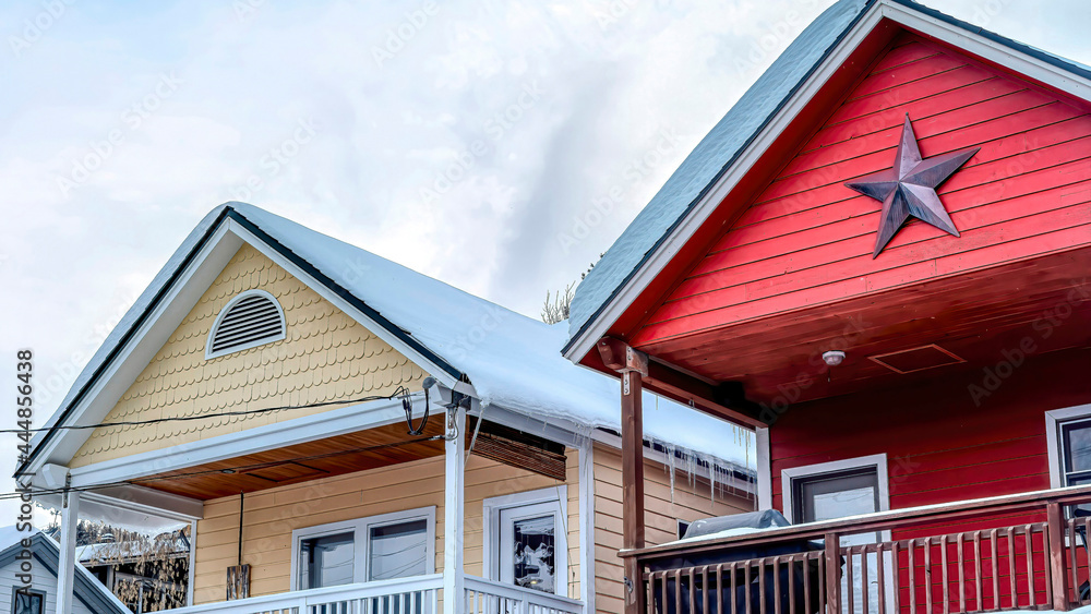 Samolepka Pano Two storey homes with balconies snowy gable roofs and garages at the facade