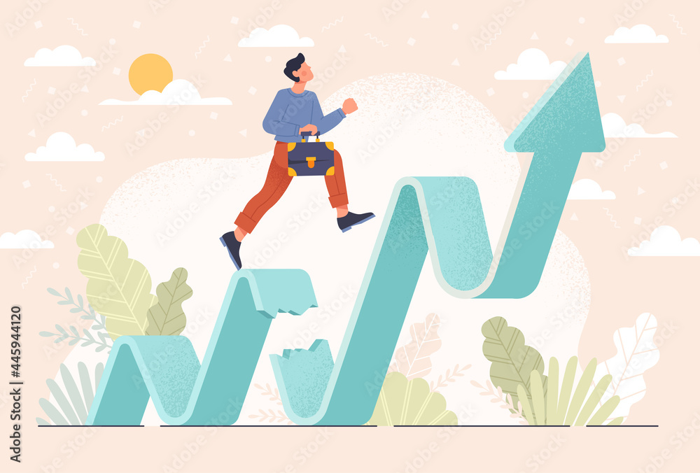 Samolepka Business challenge, revenue rebound recover from economic crisis or earning and profit growth jump from bottom concept, strong businessman jumping back to top of growing bar graph