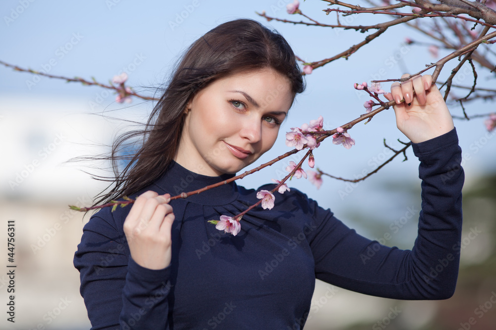 Samolepka Girl posing with blossoming peach-tree looking at camera smiling