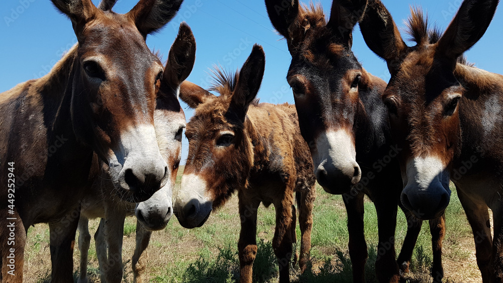 Samolepka a herd of donkeys looks at the photographer's camera
