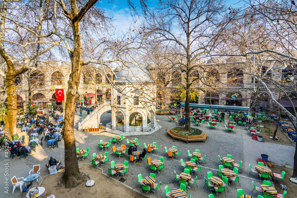 Samolepka ea gardens and silk shops that sell silk clothes, shawls and clothes in Koza Han Silk Bazaar