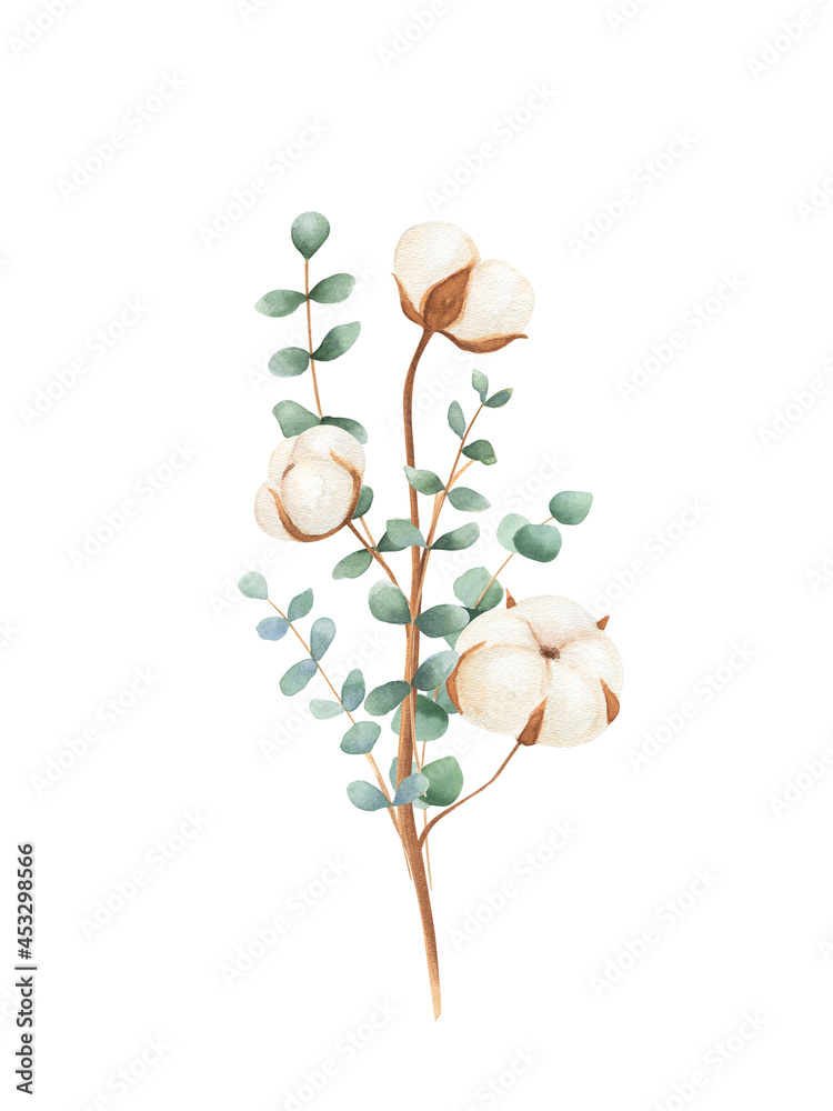 Samolepka Watercolor cotton, eucalyptus botanical illustration isolated on white background