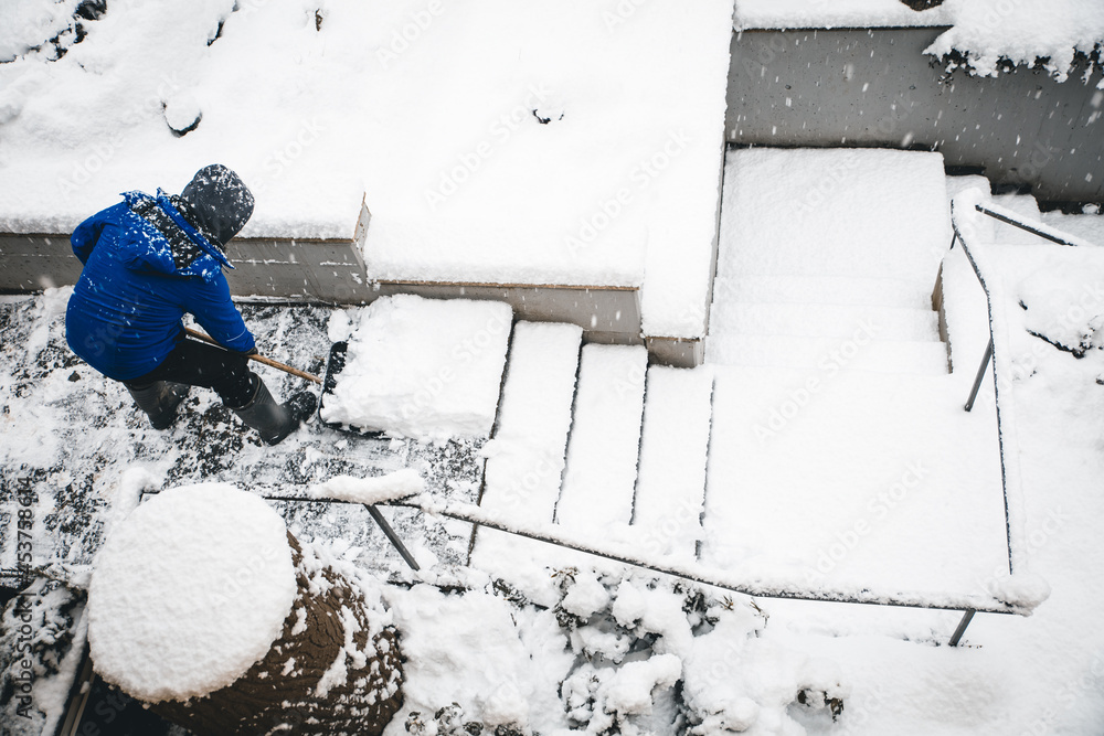 Samolepka Man shovelling staircases with a snow shovel or pusher, topview