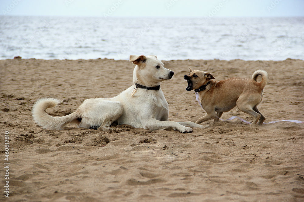 Samolepka Two golden-haired dogs bark at each other on the sea sand, the will of the sea
