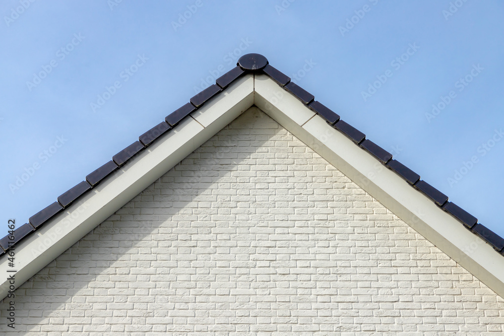 Samolepka Structure and building concept, The side of building white brick wall under blue sky as background, Architecture features traditional houses with gable roof in europe