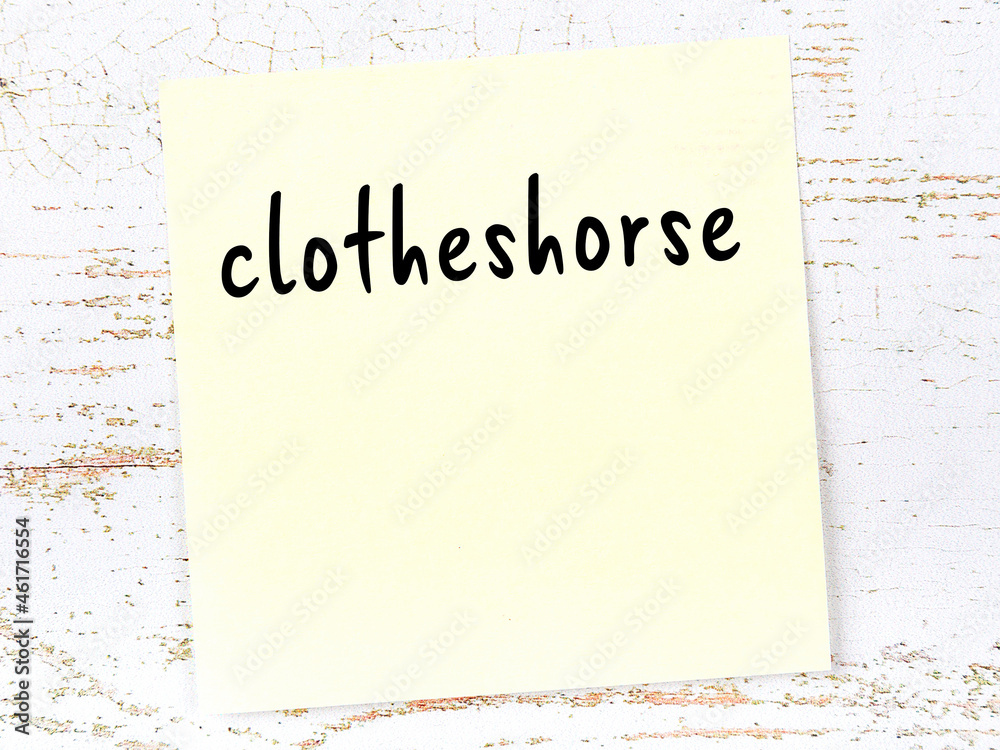 Samolepka Yellow sticky note on wooden wall with handwritten word clotheshorse