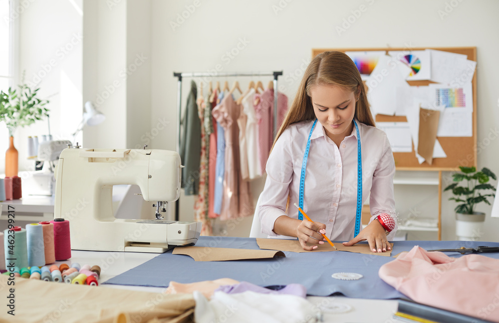 Samolepka Female tailor draws sketch on calico fabric with pencil according to paper layouts of clothes