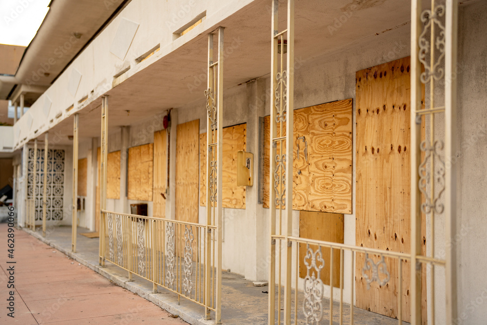 Samolepka Condemned apartment building boarded up with plywood