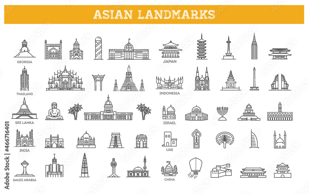 Samolepka Simple linear Vector icon set representing global tourist asian landmarks and tr