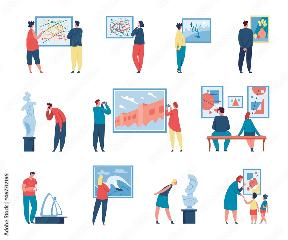 Samolepka Art gallery visitors looking at paintings, people in museum exhibition