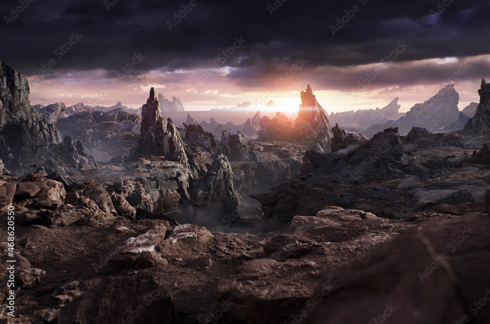 Samolepka The mystical dark world of rocks. Cinematic view. 3d render