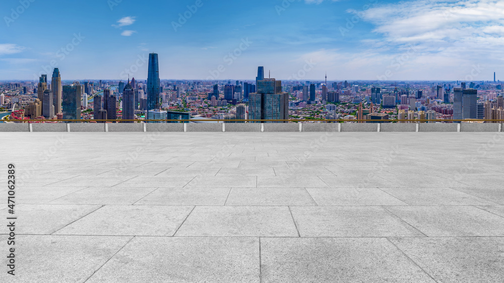 Samolepka Empty brick floor with city skyline background