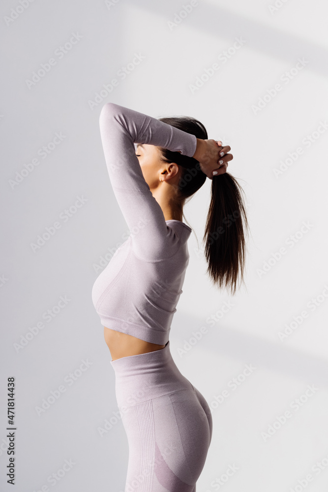 Samolepka Portrait of slim fitness woman with ponytail hairstyle before workout exercise i