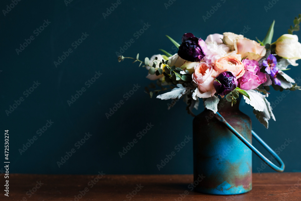 Samolepka Various fresh flowers arrangement in metalic vase on wooden table
