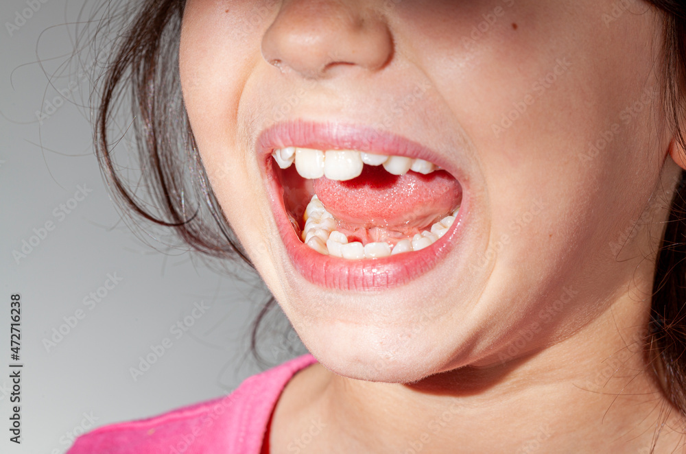 Samolepka A caucasian girl with teeth crowding is showing the inside of her mouth in a dentist exam room