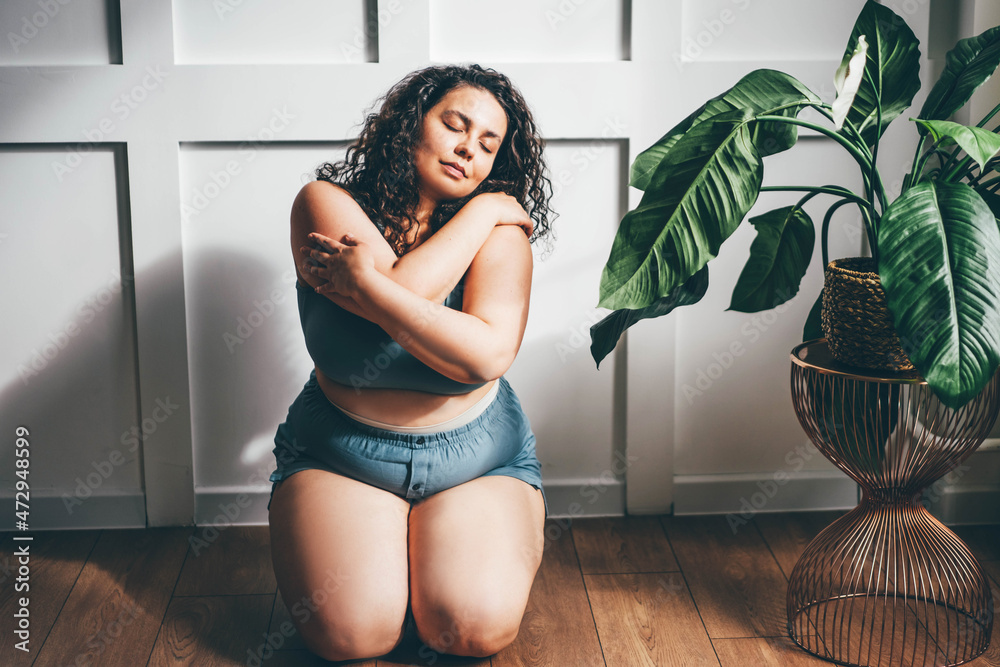 Samolepka Curly haired overweight young woman in blue top and shorts with satisfaction on face accepts curvy body shape in stylish bedroom