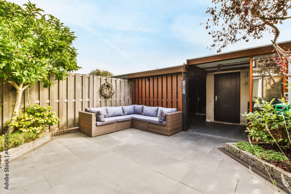 Samolepka Amazing courtyard design with wicker sofas and lots of greenery