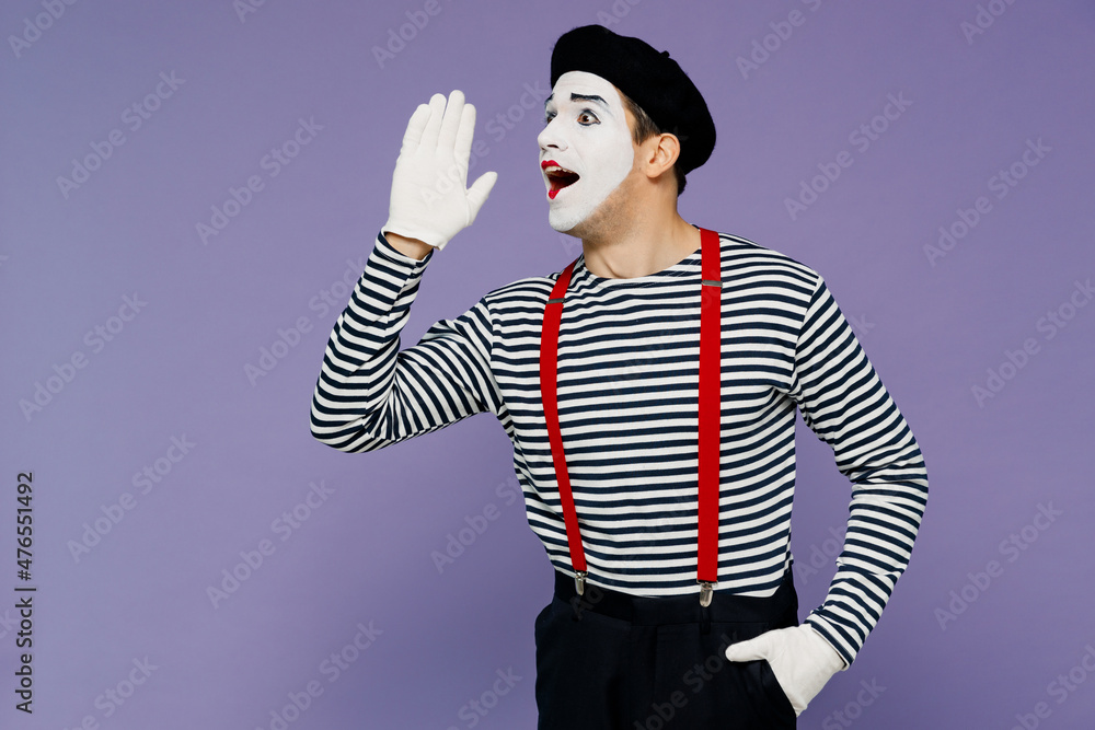 Samolepka Promoter vivid young mime man with white face mask wear striped shirt beret scre