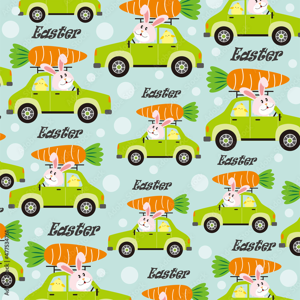 Samolepka seamless pattern with cars, rabbit, chick and carrot for easter card, gift wrap