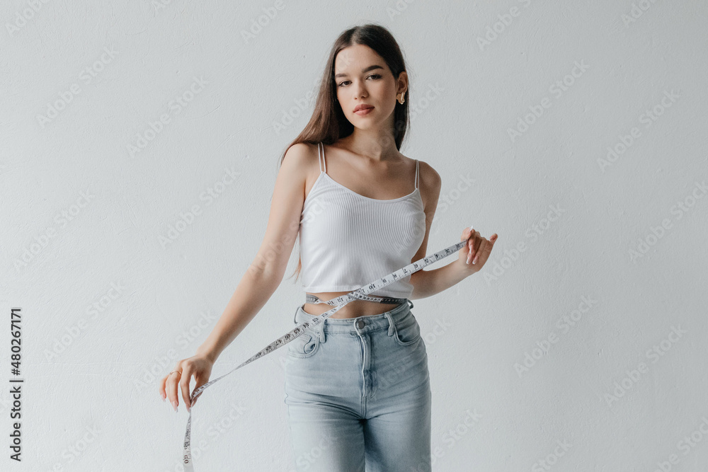 Samolepka Young brunette woman with measuring tape and a beautiful, healthy body, looking at the camera