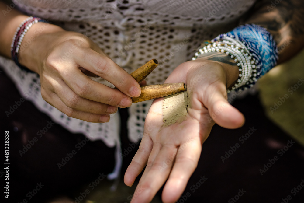 Samolepka Paulo, SP, Brazil - November 23 2021: Hands of caucasian women holding kuripe and snuff details