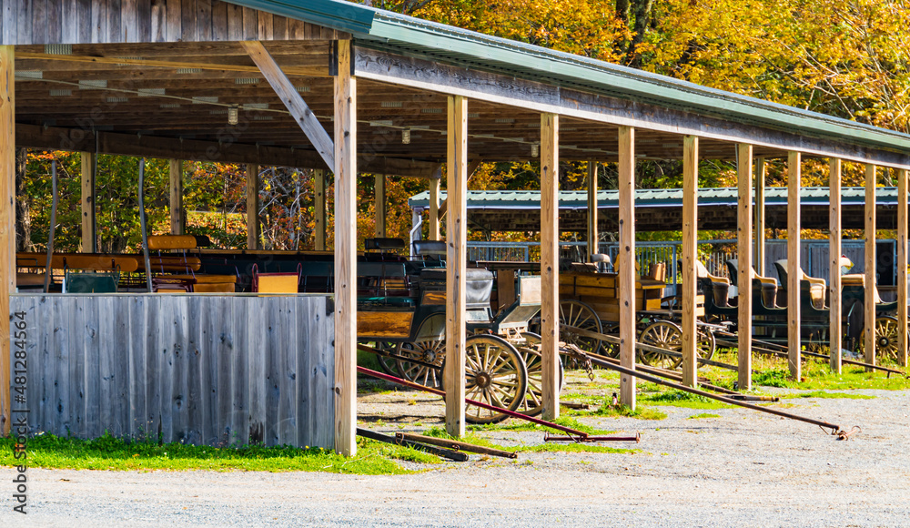 Samolepka carriages lined up for use in historic horse drawn carriage rides on the carriag