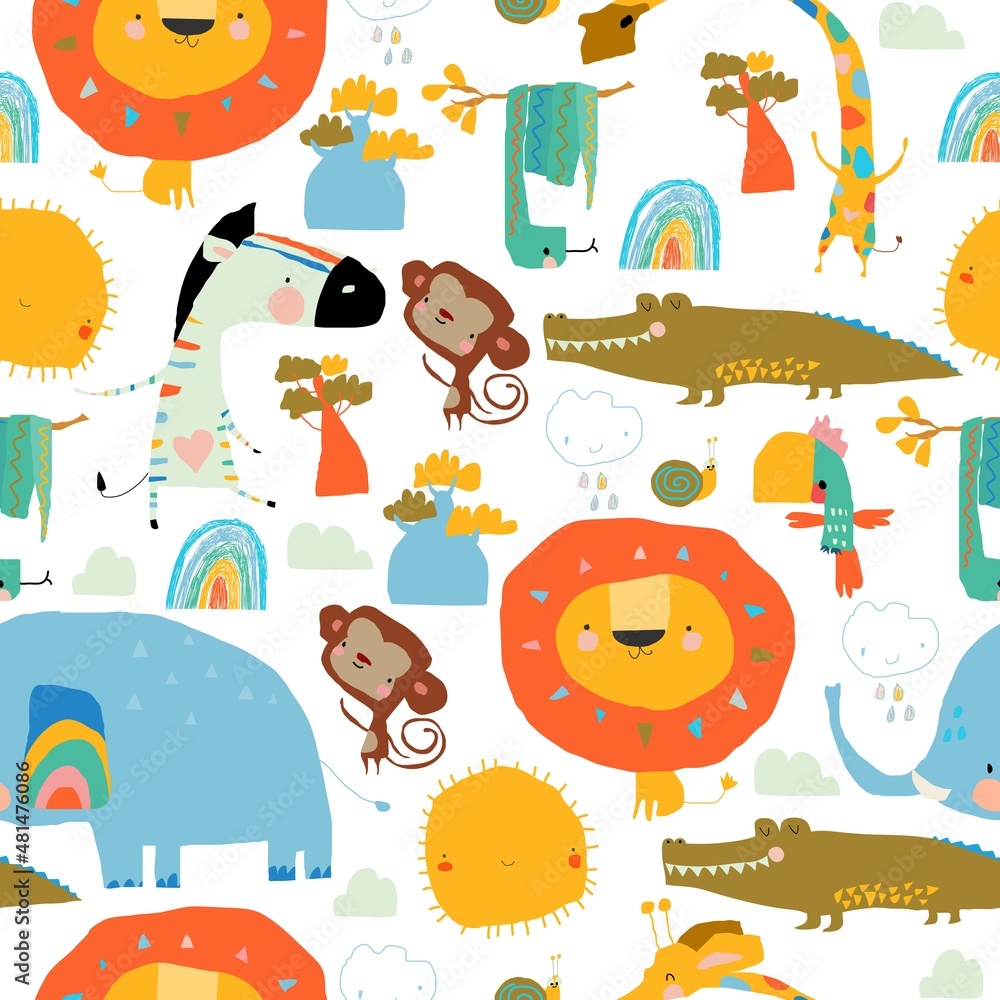 Samolepka Seamless Pattern with Cartoon Wild Animals on White Background