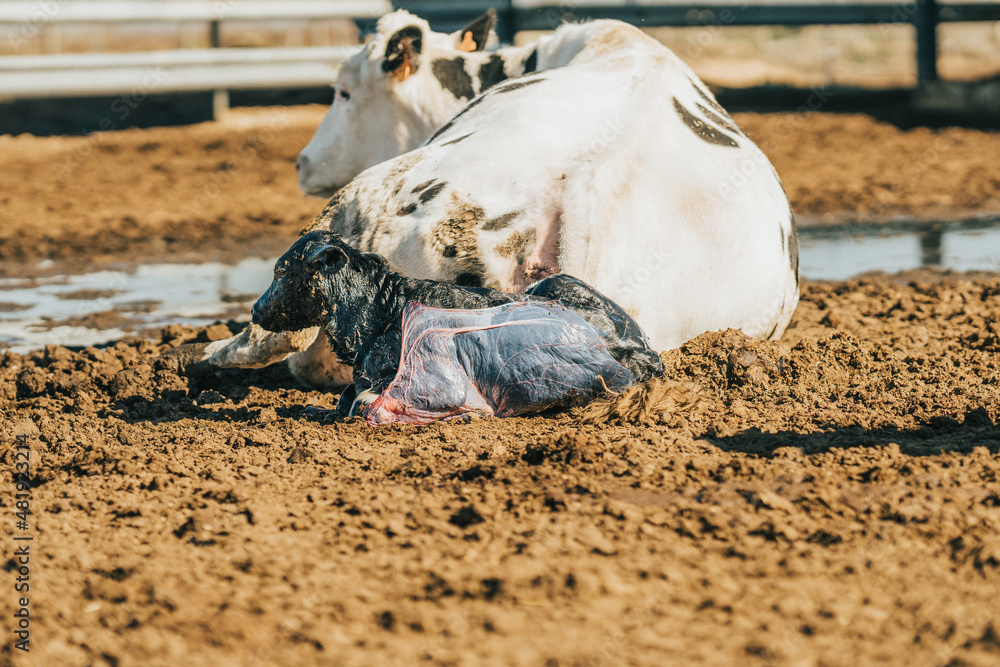 Samolepka the newborn cow calf next to its mother
