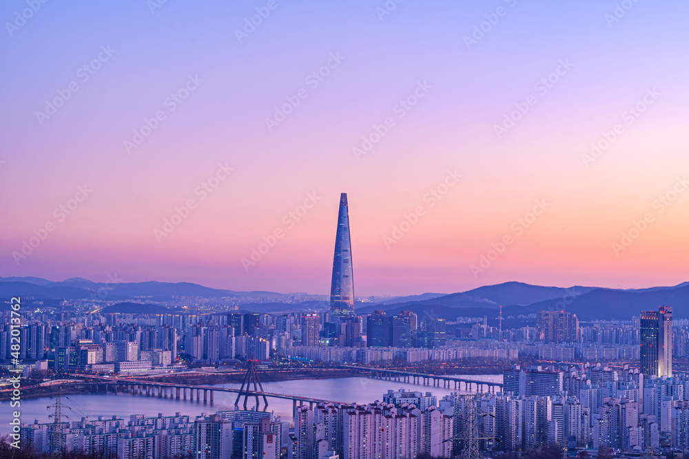Samolepka Cityscape night view of Seoul, South Korea at sunset time