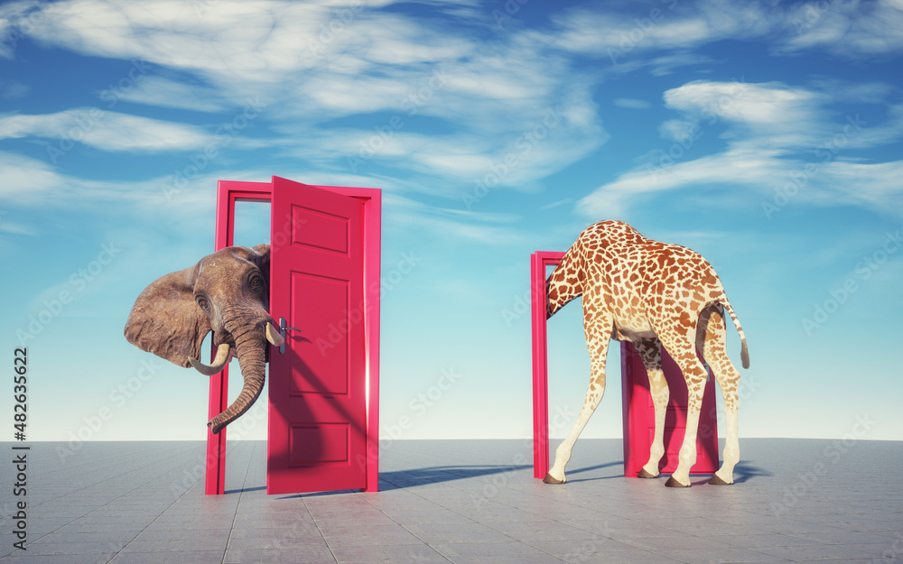 Samolepka Giraffe entering a door and gets out as an elephant.