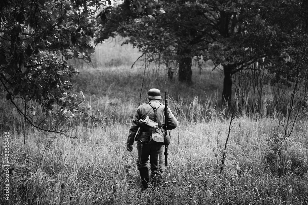 Samolepka Single Re-enactor Dressed As German Wehrmacht Infantry Soldier In World War II Walking In Patrol Through Autumn Forest
