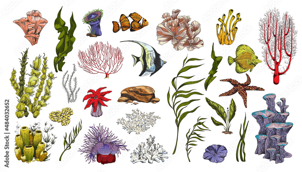 Samolepka Coral reef plants and fishes colorful icons, vector illustration isolated
