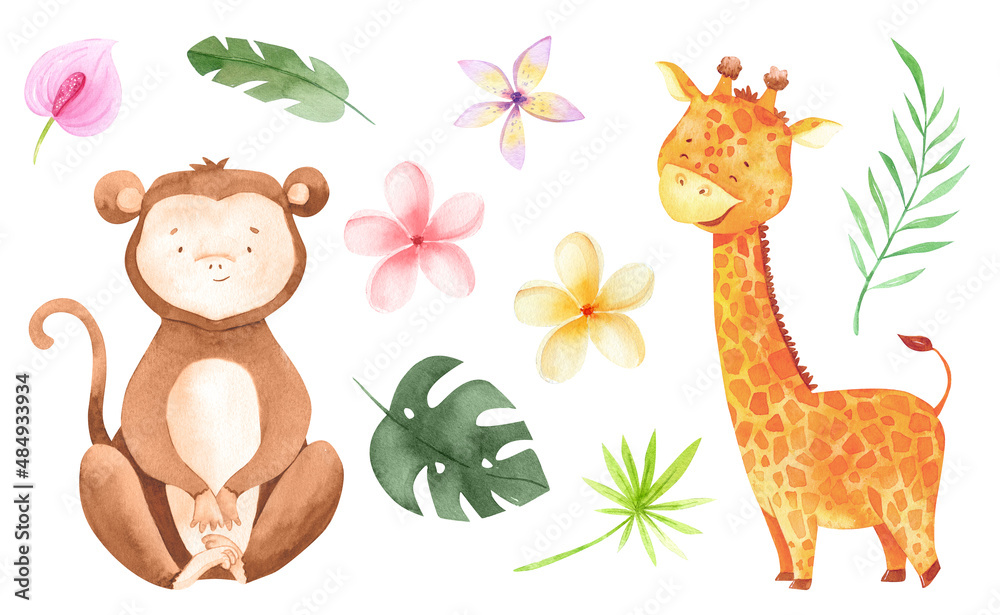 Samolepka Watercolor baby cartoon monkey and giraffe