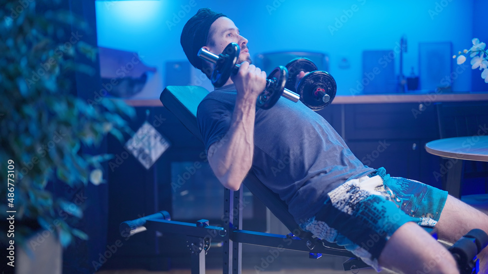 Samolepka Male person bench biceps side curls exercise at home in kitchen
