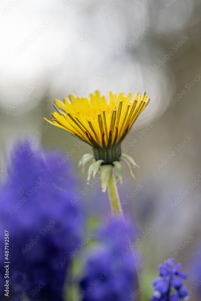 Samolepka Yellow sow-thistle flower in a green grass meadow, yellow dandelion on green background, perfect for background, texture, macro photopraphy