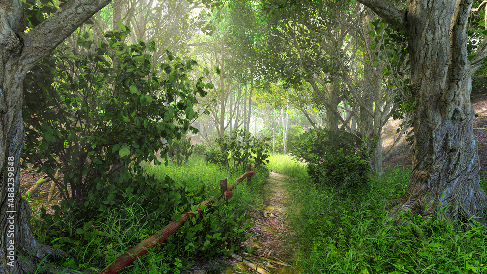 Samolepka Chemin dans la forêt calme et lumineuse avec peupliers et boulots