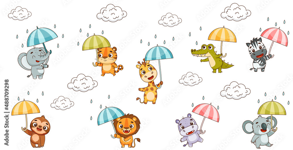 Samolepka Set kids tropical animals with umbrellas in the rain