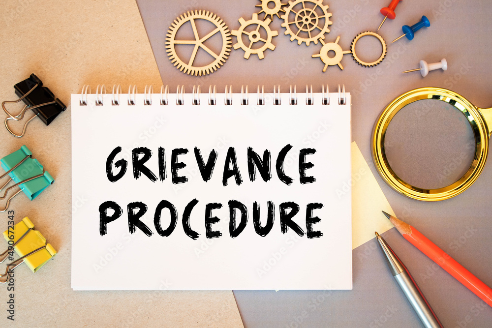 Samolepka Text grievance procedure on notepad with office tools, pen on financial report
